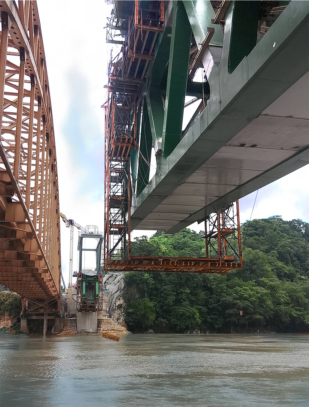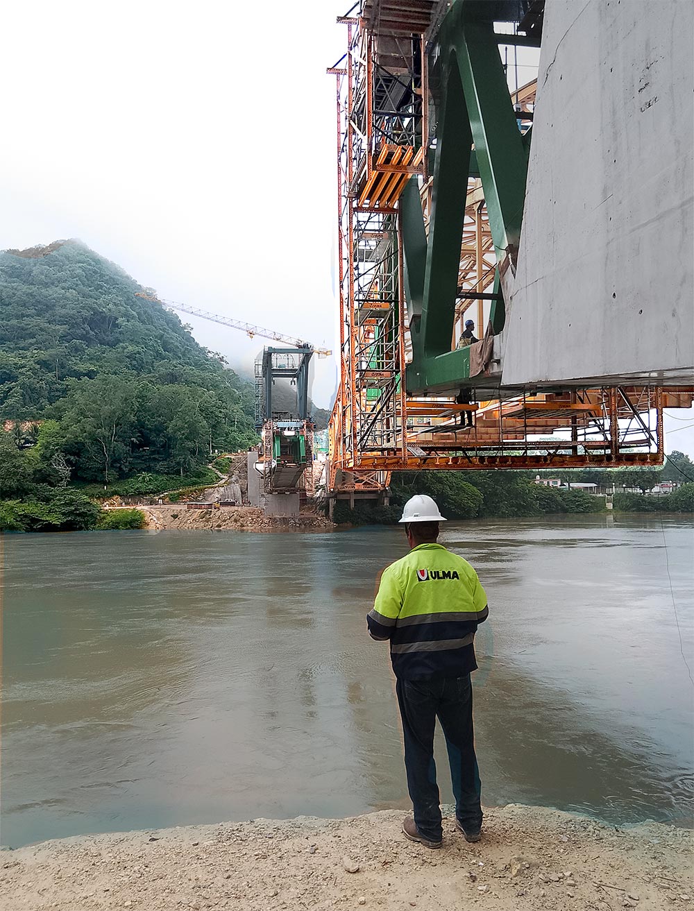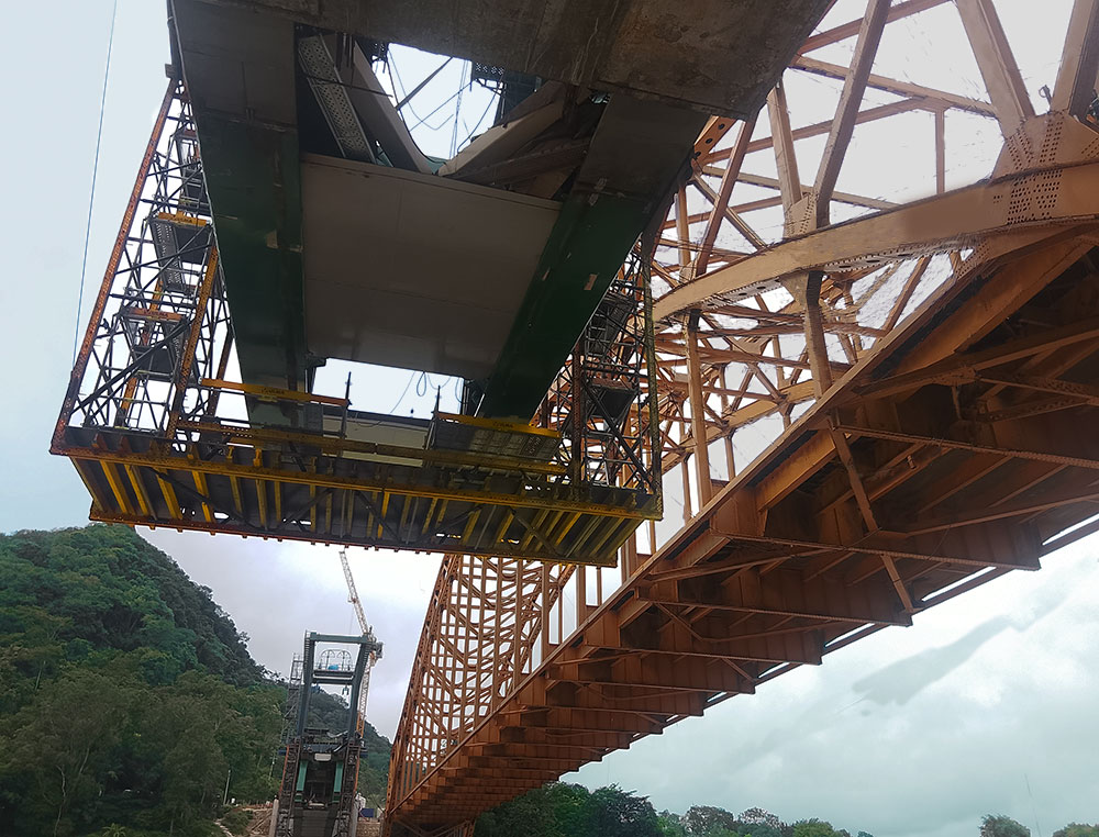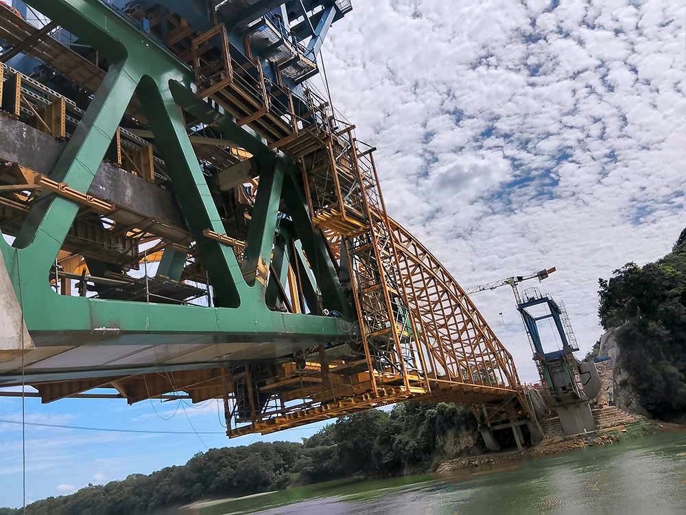 Ubicado en el sureste del país, el proyecto del Tren Maya atraviesa ríos y terrenos con el objetivo de conectar los estados del sur de México. La construcción se extiende sobre las aguas del majestuoso río Usumacinta, ubicada justo a un lado del puente vehicular Boca del Cerro, construido en 1950. Esta estructura, que soporta la vialidad del Tren Maya, ahora tiene una longitud de 160 metros. Para el arranque, se utilizaron elementos de concreto preesforzado, sin embargo, para el desarrollo del puente se empleó un carro de avance que montó una estructura de acero para la cual, ULMA suministró el equipo para las plataformas colgadas, usando Estructura MK y BRIO.