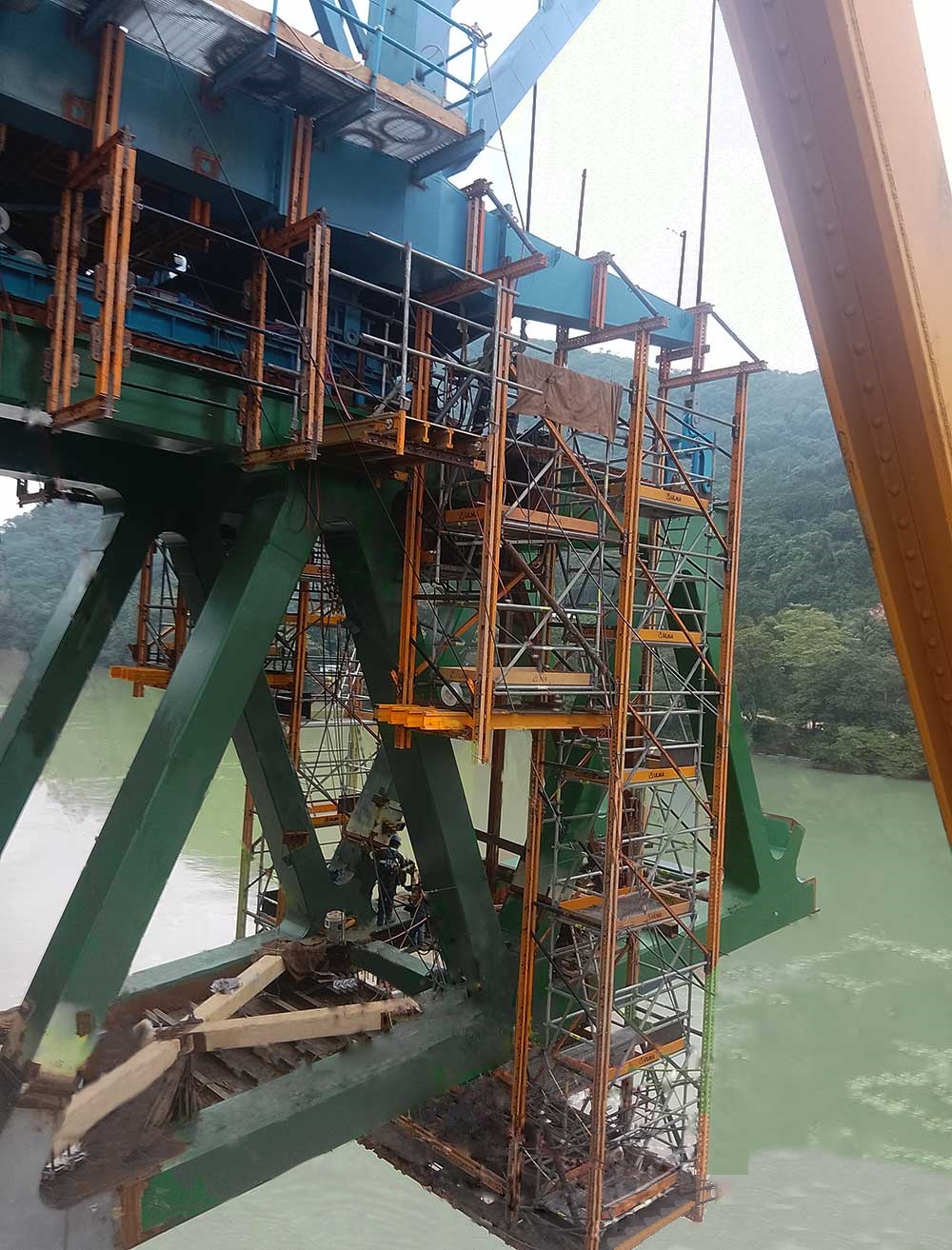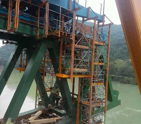 Para la construcción de este puente, se utilizó un carro de avance para colocar las dovelas metálicas que completarían la estructura. Para todos aquellos trabajos de soldadura que se realizaron para el puente de acero, se montaron plataformas colgadas que ULMA suministró, empleando nuestro sistema MK y cuerpos de Andamio multidireccional BRIO.