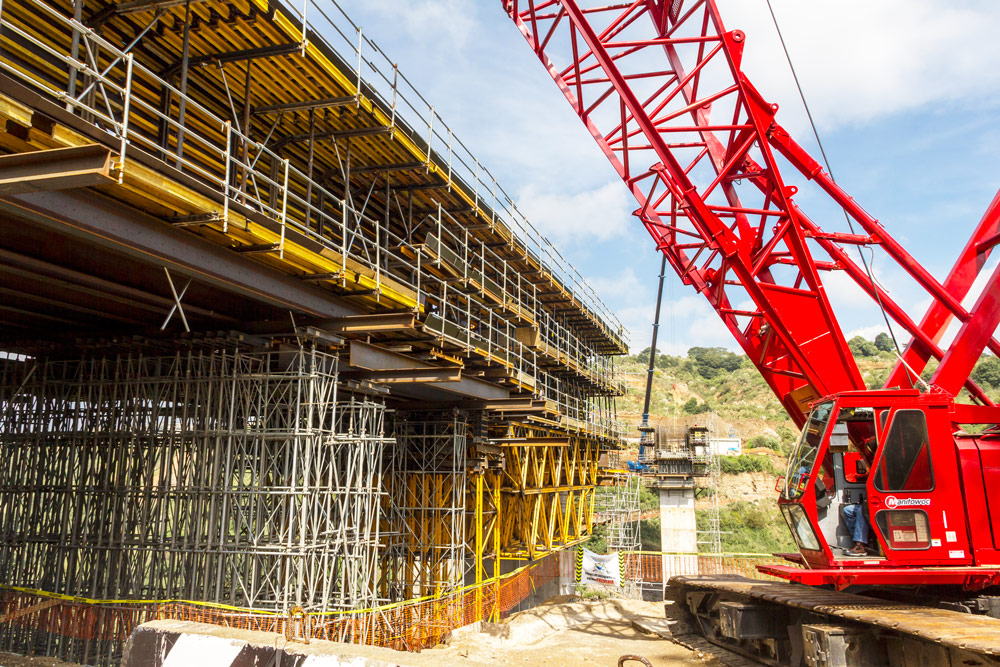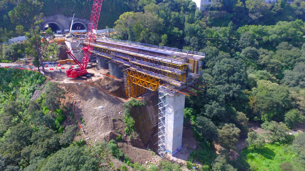Las pilas rectangulares huecas con chaflán interior, se ejecutan mediante cimbra ENKOFORM V-100 y consolas CR-250 con altura de paños de 5 m. Una vez ejecutadas las pilas se monta la cimbra porticada con cimbra OC más perfilería los tres primeros pórticos, y con Cimbra MK y Cercha MK el pórtico 4 del vano estribo 1 – pila 2. A la vez se inicia la ejecución de la dovela 0 de la pila 2 y pila 3 con apoyo sobre los perfiles pasantes de las pilas, con Cimbra OC y ENKOFORM H-120. Se cuela el viaducto en 3 fases, losa, hastiales y techo. Primero se cuelan las 2 dovelas 0 y posteriormente el vano lateral 1. Se montan los carros de avance CVS para ejecutar el vano central y un tercer carro de avance, para ejecutar el vano lateral entre la pila 3 – estribo 4. Posteriormente una vez colado el núcleo de concreto se colocan los jabalcones para completar el ancho del tablero.