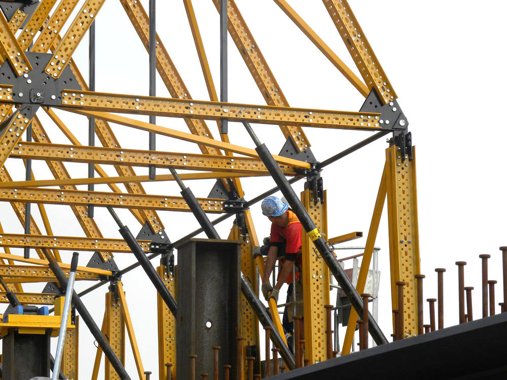 El poco peso de los componentes del Sistema MK facilita el ensamblaje manual de grandes estructuras. Así, el empleo de la grúa se limita al alzado de conjuntos antes montados sobre el terreno. Este factor resultó fundamental para reducir costos durante la ejecución de la obra.