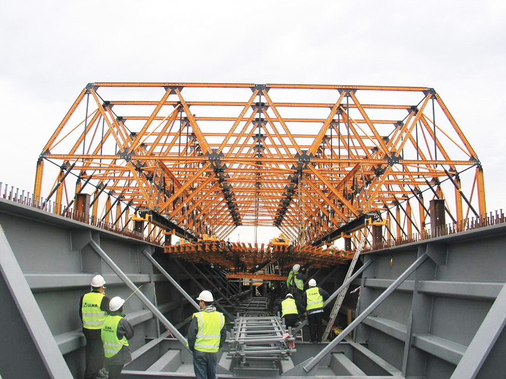 ULMA proporcionó material para la ejecución del tablero mixto, estribos, pilas, pasos superiores y muros de contención. Para ejecutar las alas del tablero se empleó un carro compuesto por elementos estándares del Sistema MK. Esta estructura, dividida en 3 partes que facilitan su montaje, aporta la rigidez necesaria sin adquirir por ello mayor peso. Además, ofrece una solución estandarizada a medida y asegura una rentabilidad máxima.