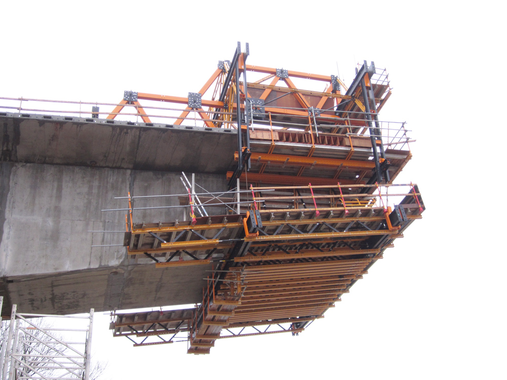 Las pilas de 15 a 18 m de altura se realizaron con Cimbra ORMA, combinado con la Consola de trepado CR-250. En un solo movimiento de grúa, cada conjunto se iza a la siguiente puesta junto con sus amplias plataformas.