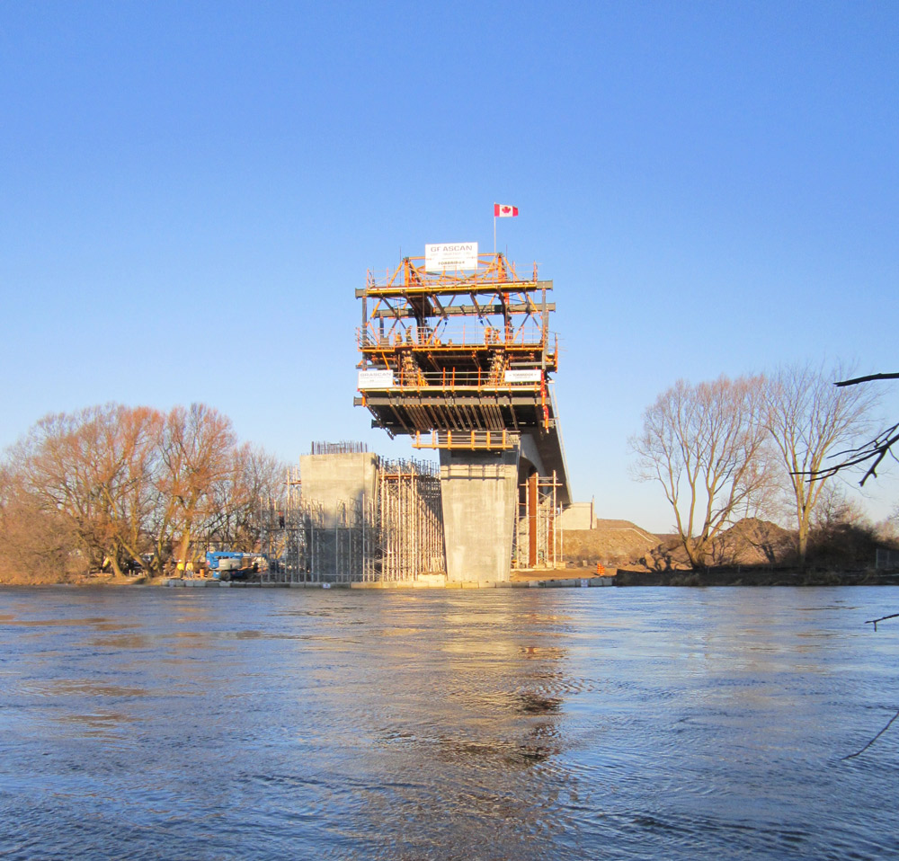 Este vano, levantado mediante dovelas sucesivas in situ, convierte a este puente en el primero construido en Ontario con esta técnica desde los años 80. ULMA puso al servicio del cliente el sistema más avanzado y los especialistas más cualificados en su aplicación, idóneo en orografías accidentadas, más comunes en Europa.