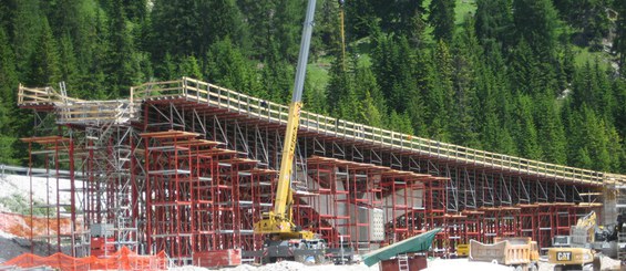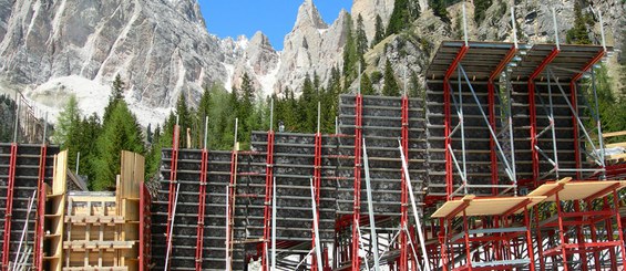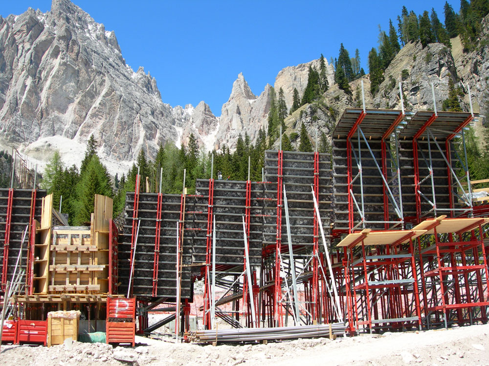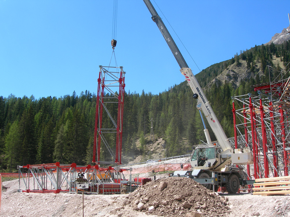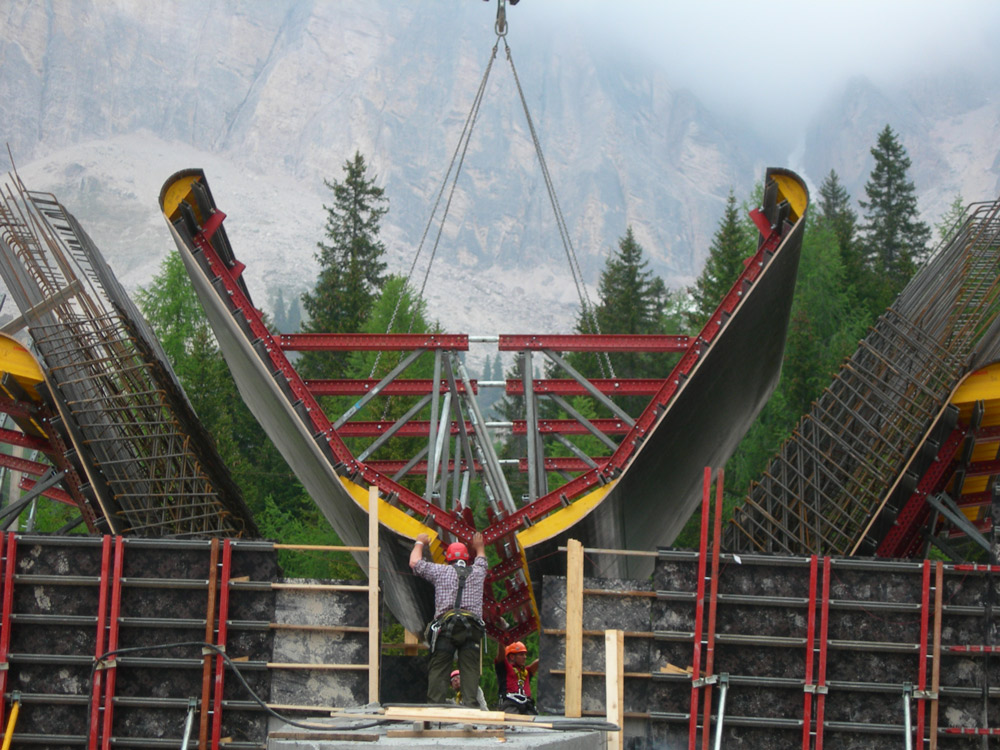 La curvatura específica y la geometría inclinada se resolvieron mediante husillos amoldables a cualquier dirección sobre el apuntalamiento. Ello garantizó unos ajustes perfectos sin utilizar plantillas de madera, lo que supuso un gran ahorro en costos.
