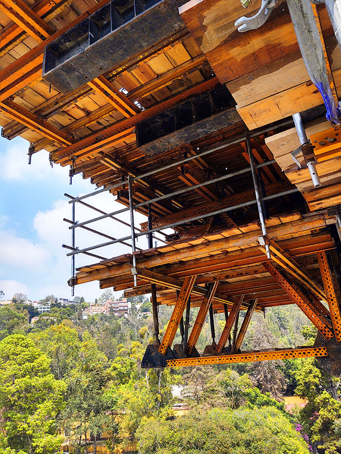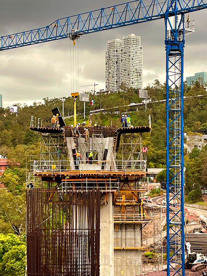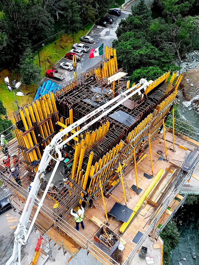 Para el diseño de la Dovela 0, al no contar con un espacio suficiente para la correcta ejecución de los trabajos, el equipo de ingeniería propuso una consola de gran carga, dónde la solución se realizó a 26m de altura en voladizo sin apoyo en el terreno. La CONSOLA DE GRAN CARGA-MK está formada por riostras MK-120 y MK-180, lo que garantiza una alta capacidad de carga. Cada cercha dispone de dos anclajes para los esfuerzos de tensión, así como una pieza que trasmite directamente las cargas a la pila, previamente ejecutada, la cual absorbe todas las cargas verticales. Algunas de estas piezas han sido empleadas por primera vez en por el departamento técnico de ULMA México, que aportó una solución certera y segura para este tipo de proyectos.