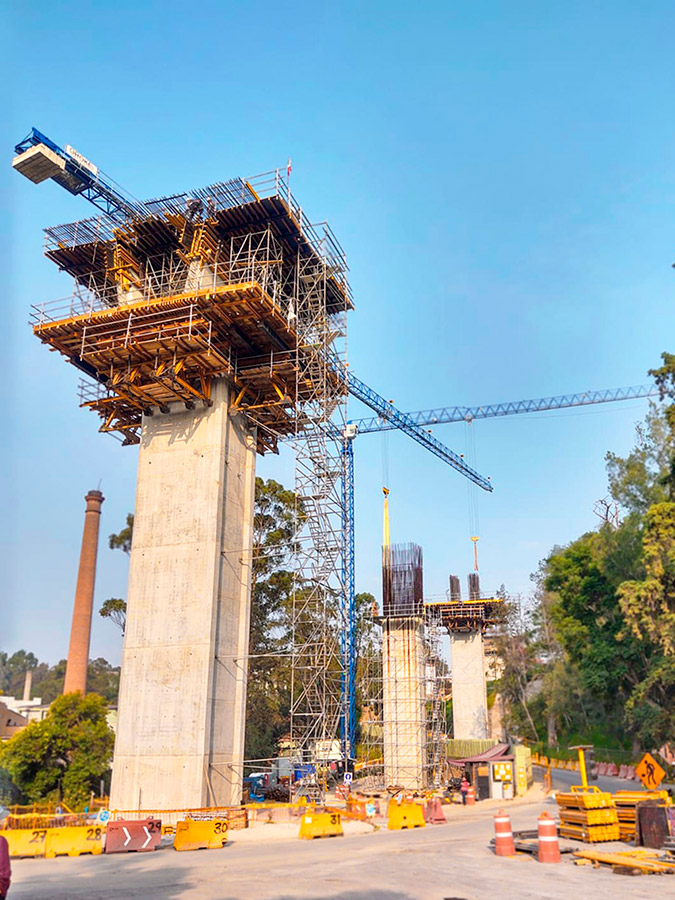 En la zapata se empleó un sistema de paneles ORMA. Posteriormente la elaboración de las pilas fue diseñada, calculada, con ENKOFORM V-100 a alturas de 4.90m ejecutando 6 eventos de colado donde se aplicó CONSOLA CR-250 para el trepado de los paneles en el exterior y de forma interna PLATAFORMA KSP.