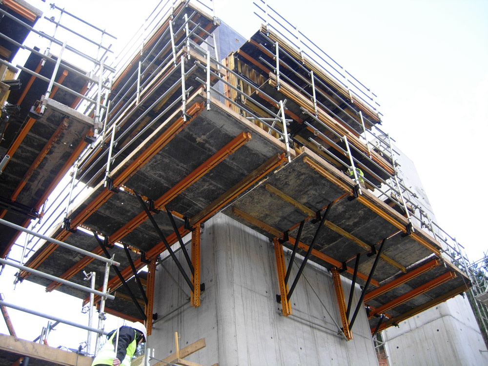 El apoyo se basa en una cimbra porticada con T-500 y Cerchas H-33, transmitiendo cargas a una torre provisional por vano y a las pilas mediante el uso de Consolas MT.