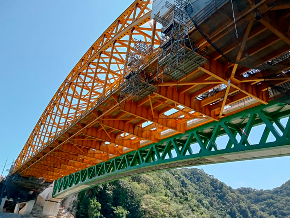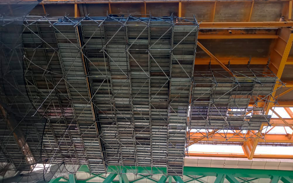 Se implementaron dos tipos de estructuras temporales: el andamio bajo puente y el andamio en la zona de ménsulas. La primera estructura, una plataforma suspendida bajo el puente, consistió en un andamio colgante de 36 metros de largo por 13 metros de ancho, equivalente al ancho de la vía. La planificación de la obra contempló el anclaje del andamio a la estructura existente, así como su desplazamiento a lo largo del puente, conforme a las necesidades de las maniobras de mantenimiento.
