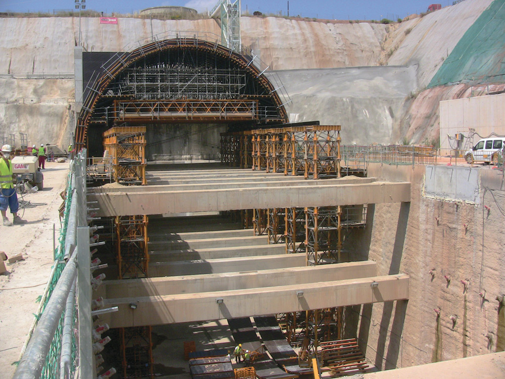 El carro, de 14 m de longitud y 22 m de diámetro de bóveda, cubrió una longitud de 130 m en tongadas sucesivas de 12.35 m.