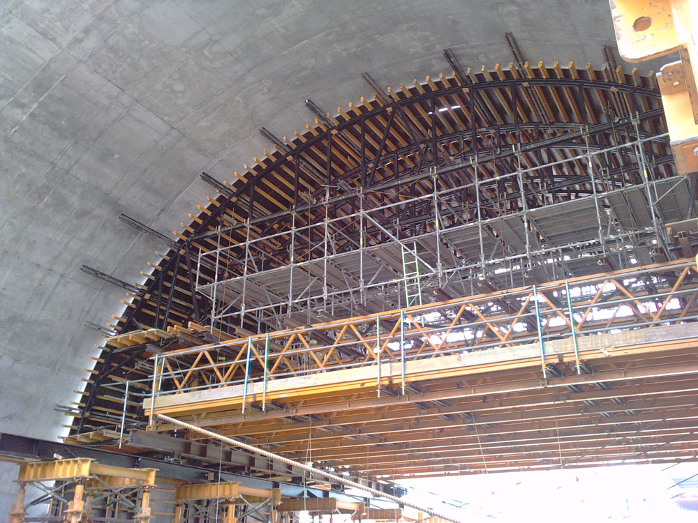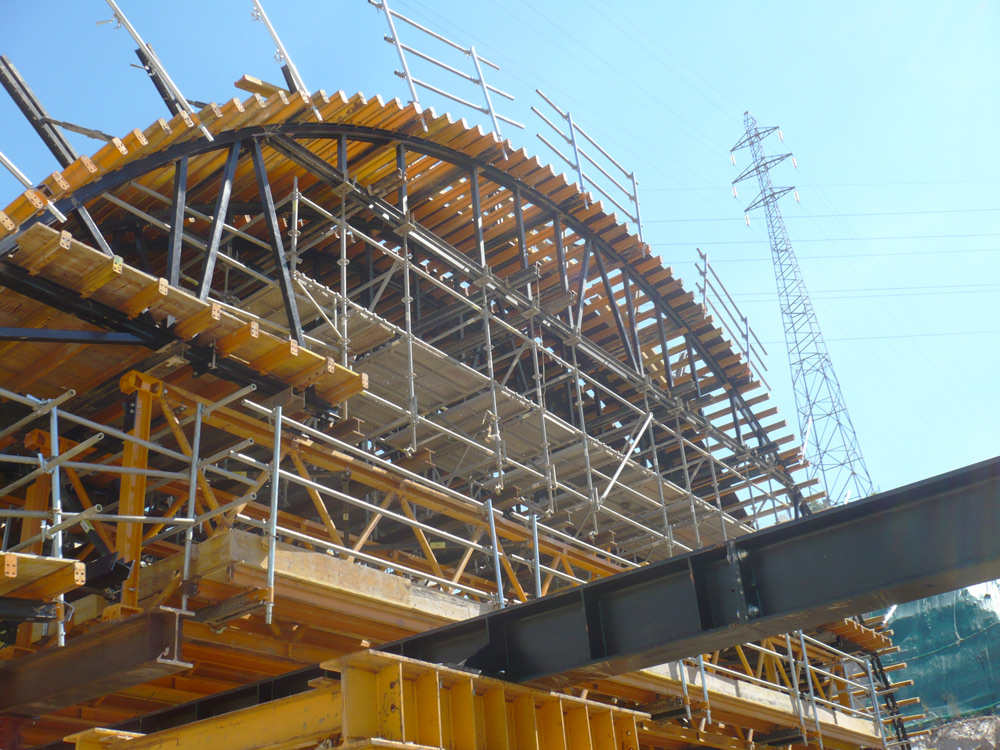 Los trabajos se realizaron a 17 metros de altura, ya que en el piso inferior circula el metro y las losas intermedias tienen un espesor reducido. Al no poder emplear el sistema de apuntalamiento uniforme, se planteó una compleja solución técnica: a partir de un carro porta-cimbra en altura, y apoyado en Cimbra T-500, Estructuras H-33, BRIO y riostras curvas, se salvaron refuerzos transversales de concreto cada 5.2 m.