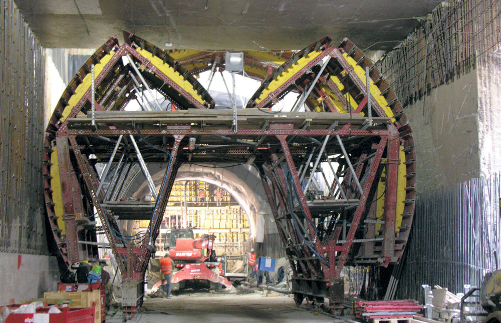 - Ciclo de colado: 2 días. Con el Sistema MK, como cercha con cimbra de forma, se ejecutaron muros de hasta 12 m de longitud. Ideal para largas estructuras, proporcionó una amplia gama de secciones en túneles, al margen de formas y cargas.