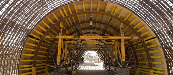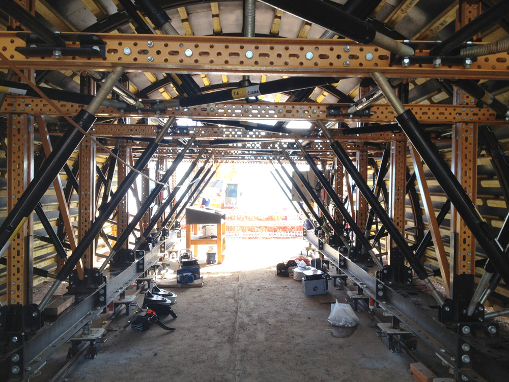 Para satisfacer estas necesidades se emplearon Carros de Túnel MK. Las conexiones entre riostras del Sistema MK proporcionan gran rigidez y exigen menos material. Además, facilitan la colocación de mayores plataformas de colado que las usuales.