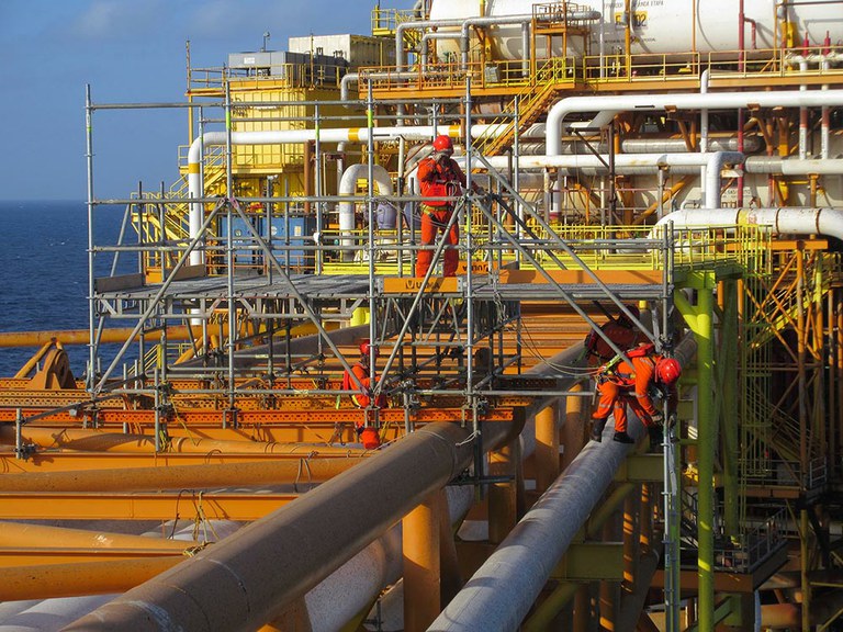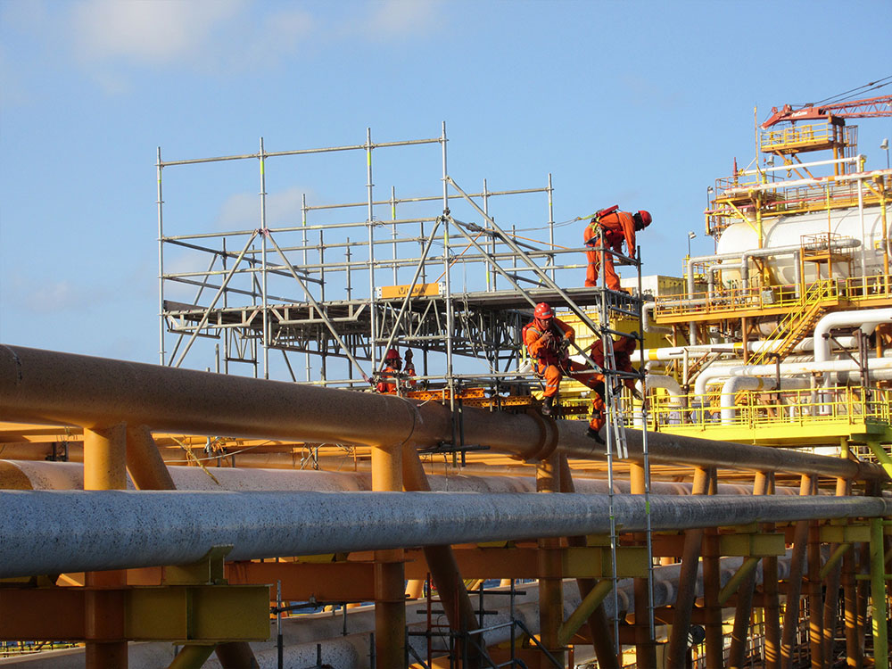 Los proyectos costa afuera conllevan riesgos que exceden a los de los proyectos de acceso estándar. El contratista Dragados Offshore requería un plan de acceso seguro para recubrir, soldar e inspeccionar la plataforma petrolera en sus diferentes frentes de trabajo. El andamio multidireccional BRIO fue la opción óptima para el proyecto. El espacio bajo de la plataforma petrolera era limitado, pero las plataformas con trampilla BRIO permitieron el acceso seguro y fácil a las zonas de trabajo.