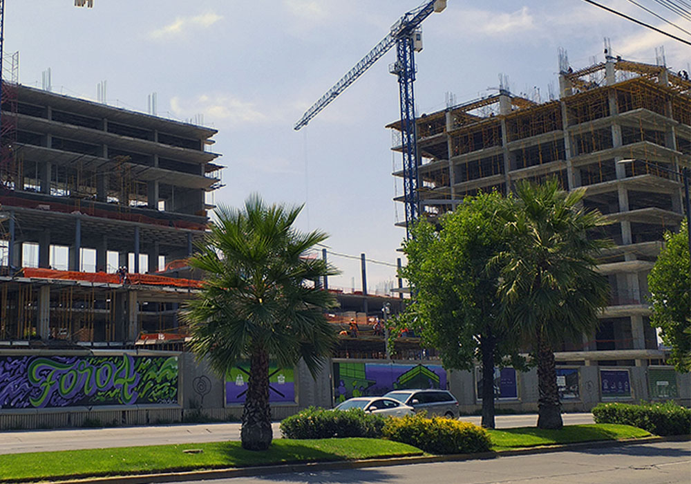 Para la zona de comercio, oficinas y hotel, se han empleado dos sistemas. En la ejecución de losas se ha optado por el sistema RAPID y para las trabes de mayor peralte, se ha usado el sistema ENKOFLEX, con apoyo de la CIMBRA G y el Puntal SP. El nivel de planta baja de esta zona es de doble altura y para resolverlo se ha trabajado con CIMBRA G.