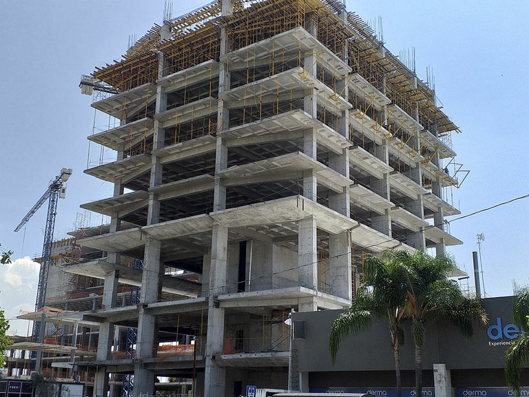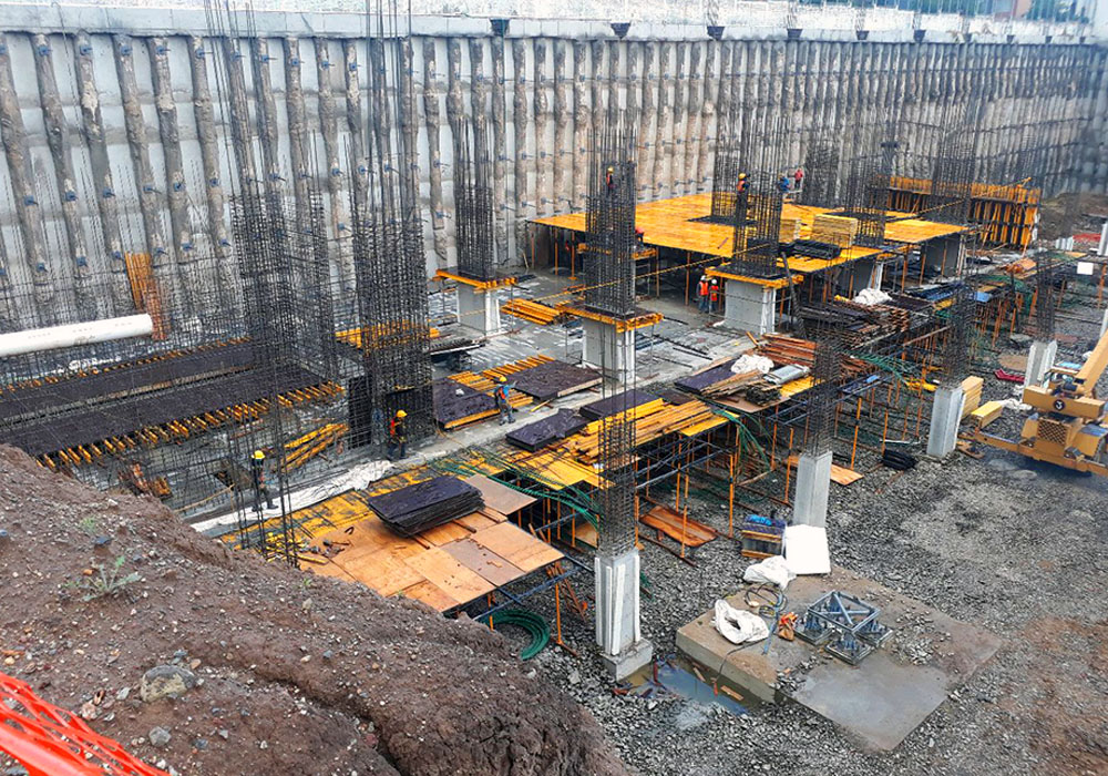 Para la ejecución de los muros del elevador, se ha utilizado la plataforma interior KSP como plataforma de trabajo y como cimbra se ha empleado el sistema ENKOFORM y la CONSOLA CR-250. Para las escaleras, la solución adoptada ha sido el encofrado de vigas ENKOFORM. En la zona de estacionamiento, la solución empleada para el cimbrado de losas es el sistema RAPID con Puntal SP. La CIMBRA BRIO se ha utilizado para resolver la zona de los pilares en los estacionamientos.