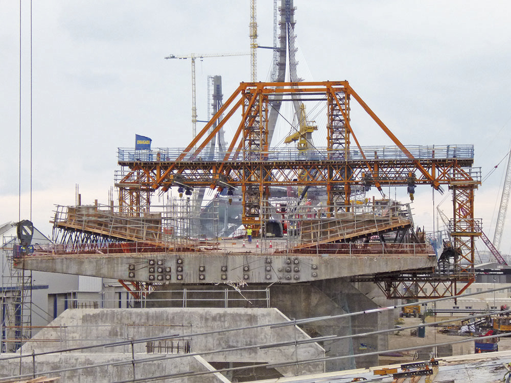 En estos dos tramos, la cimbra de fondo disponía de inclinación variable, de ahí que los paños se diseñaran en tres partes articuladas. De esta forma fue posible realizar todo el tramo sin tener que retocar la geometría en cada fase.