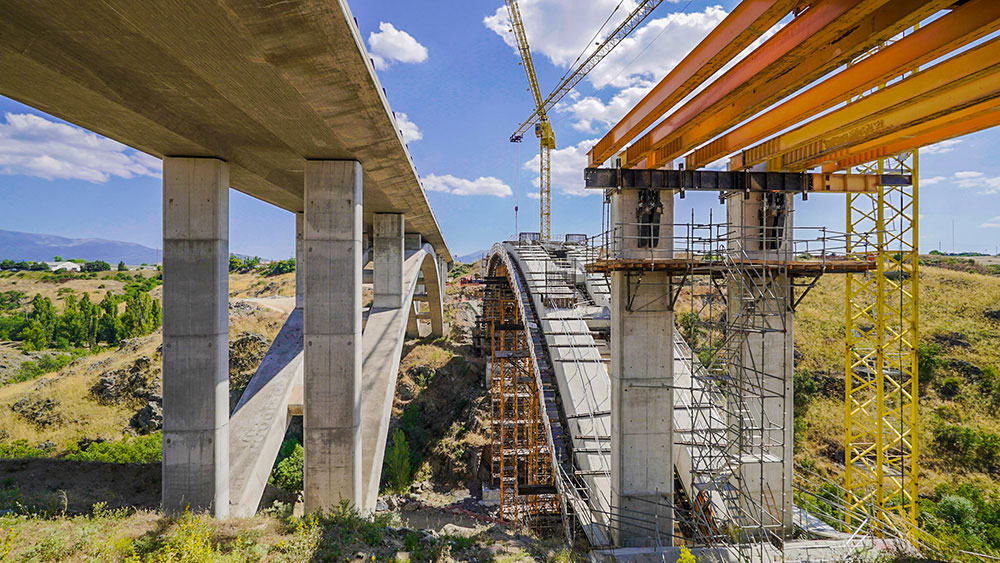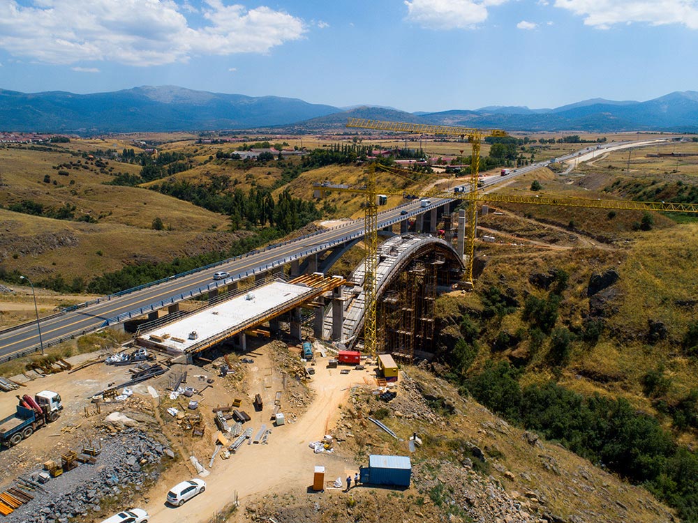 En el arco, ULMA ha propuesto una solución de cimbra porticada sobre zapatas para salvar un terreno escarpado y con pendiente. La geometría del arco se ha conseguido colocando cerchas H-33, de 20 m de longitud, con una doble cimbra.