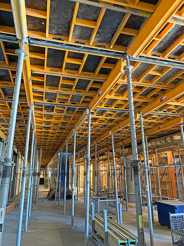 Con el objetivo de ejecutar los núcleos en una sola tongada, en el reducido espacio entre los muros se han empleado consolas de trepado estrechas. El diseño de los elementos ha permitido desarrollar una solución de sistemas trepantes asimétricos con pares de consolas instaladas en el mismo paramento. Para la ejecución de los forjados, con un canto de 30 cm y de 25 cm en los niveles bajo y sobre rasante respectivamente, se han empleado encofrados modulares de aluminio CC-4. La combinación de estos con el cabezal de caída ha permitido mantener altos ritmos en el hormigonado de losas con superficies superiores a 1000 m2.