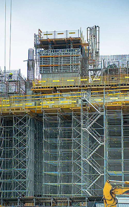 Para ofrecer un espacio de trabajo seguro y cómodo en gran altura se han utilizado 40 pantallas de protección perimetral HWS, incluidas las de almacenamiento desembarco y acceso. Los módulos estándar se utilizan como protección perimetral del nivel en el que se está trabajando y de los dos niveles inmediatamente inferiores a este. A su vez, los módulos de almacenamiento, equipados con plataformas, sirven para el acopio de los elementos del encofrado de losa previstos para utilizarse en el nivel siguiente. Finalmente, los módulos de acceso constituyen una protección adicional del tercer nivel inferior, y se han equipado con plataformas y escaleras BRIO.