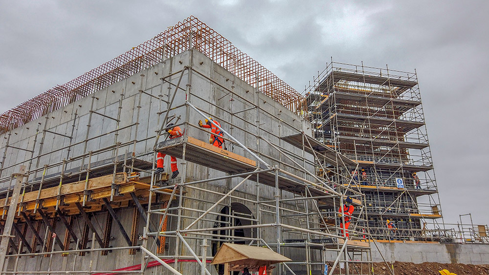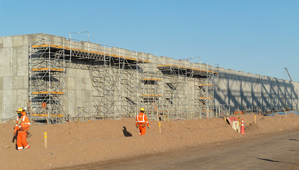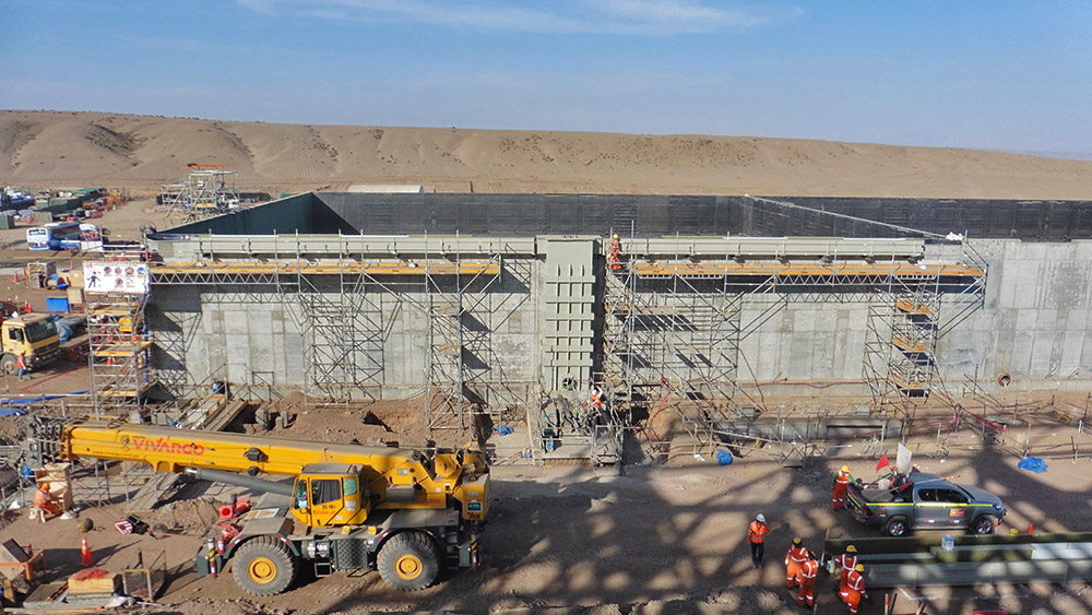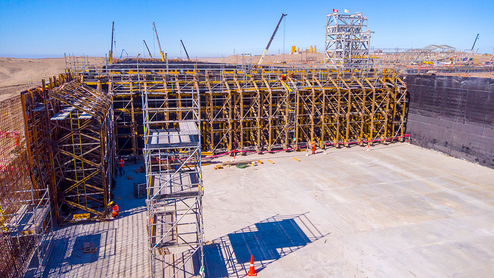 Las estructuras destinadas al almacenamiento o apilado del material y a las operaciones de triturado, están configuradas por una gran cimentación, placas y losas pesadas que presentan una geometría rectangular en planta. Tanto la ejecución de la cimentación como de los muros, se ha realizado mediante el sistema de cimbra modular ligera LGW, utilizando la barra roscada DW15 para soportar la presión ejercida por el hormigón. La estructura para el almacenamiento de material o stockpile comprende dos niveles de muros y losas. Las consolas BMK se han empleado para sostener la cimbra de muros y el anillo exterior, además de ofrecer plataformas para habilitar espacios de trabajo seguros.